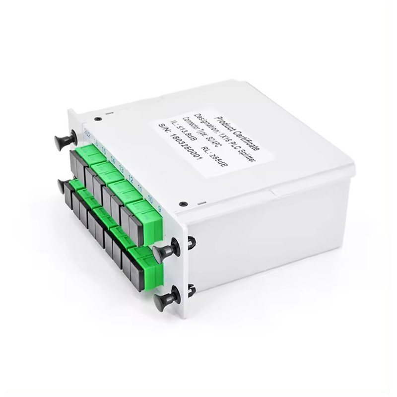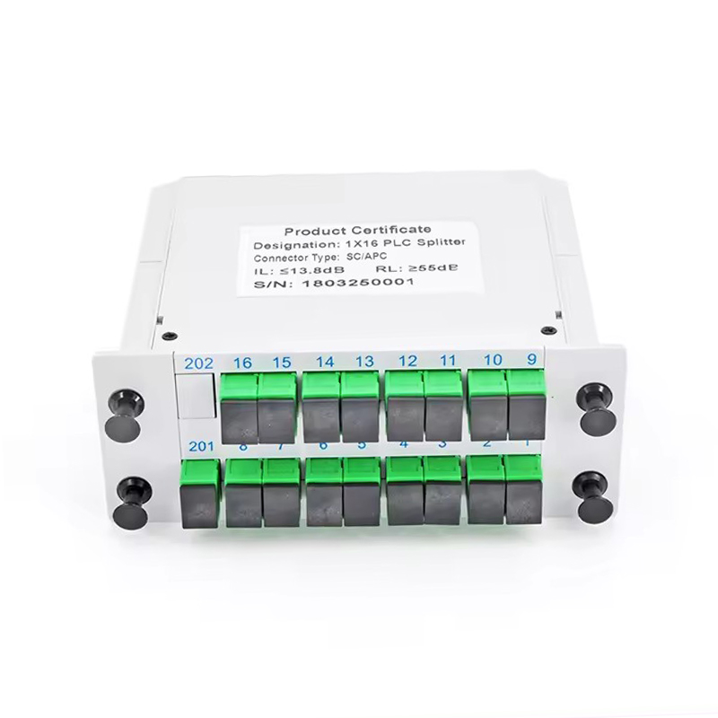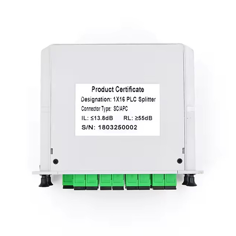 Splitter PLC cu fibră optică GSG-LGX-1x16-SC APC. Bazat pe tehnologia de ghidare de undă integrată pe substrat de cuarț, splitter-ul PLC are pierderi reduse de inserție, pierderi scăzute dependente de polarizare și uniformitate bună a canalului, asigurându-i stabilitatea și fiabilitatea în diverse medii.